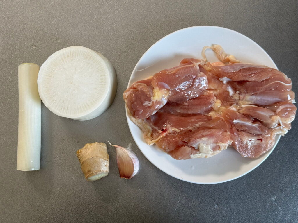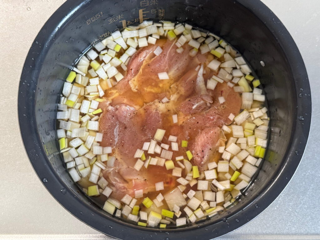 ② 炊飯器にセットする 鶏肉と大根と長ネギ、調味料を炊飯器にセットするだけ。あとは炊飯器にお任せです。
