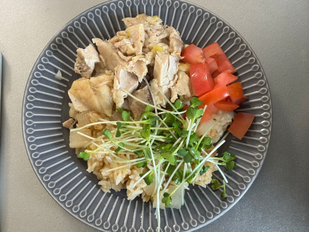 炊飯器で炊いている間に鶏肉の脂と旨味がごはんにじんわりしみこんで、普通の白ごはんとは全然違うリッチな味わいになります。油をまとったごはんが、さらっとしていて食べやすく、和風カオマンガイを作ると絶対におかわりしてしまいます。甘辛のタレがしっかり味をまとめてくれて、さっぱりしたトマトとカイワレがいいアクセントになっています。