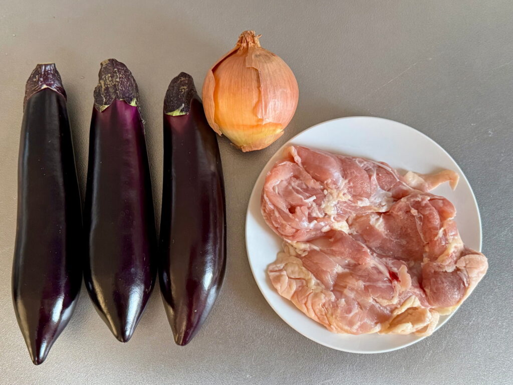 ① 材料を準備 鶏肉となすをカットして準備します。材料がシンプルなので買い物も楽です。