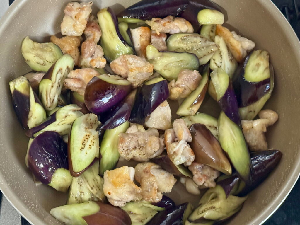 ③ 南蛮酢をからめる 焼き上がった鶏肉となすに、先に作っておいた南蛮酢をからめて完成です。甘酸っぱいタレがたまりません。